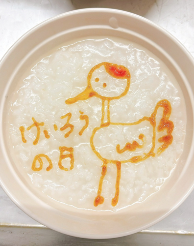 長寿の象徴である「鶴」をイメージした飾り粥をご用意しました。お粥の上に、丁寧に描かれた美しい鶴と「けいろうの日」の文字が添えられ、心温まる仕上がりとなりました。多くの方から「可愛らしい」「素敵だった」とご好評いただきました。 |