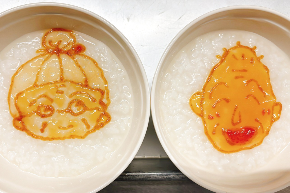 幸運な数名の方には「特別な飾り粥」を提供いたしました。おじいちゃんとおばあちゃんの可愛らしい顔が描かれ、温かい気持ちをお届けしました。 |