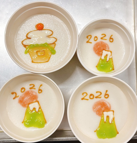 ゼラチン粥を召し上がる方には、「2026」の文字と門松をあしらった飾り粥を提供しました。