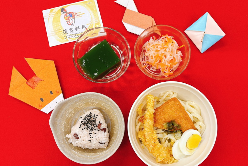 職員向けにもお正月特別メニューを提供しました。年明けうどん、紅白なます、抹茶ゼリー、赤飯のおにぎりという内容です。