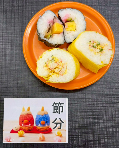 のり巻きと卵巻きの2種類の巻き寿司を提供いたしました。 のり巻きは、3ヶ所に切れ目を入れて食べやすいように工夫しました。 |
